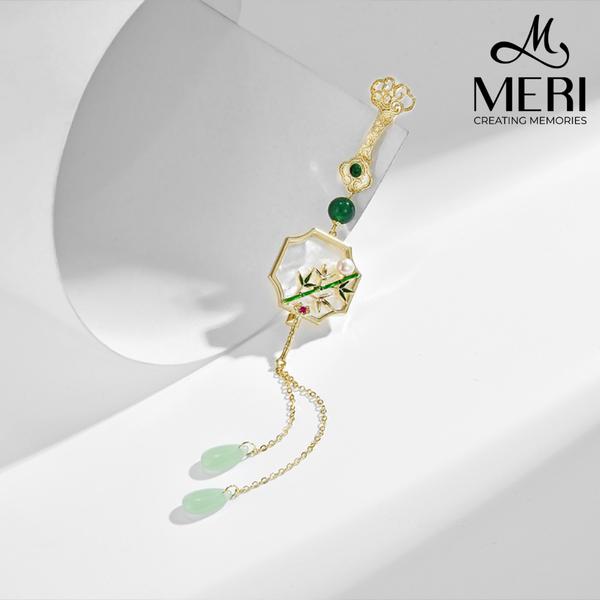 Ngọc trai tinh khôi kết hợp cùng viên ngọc bích tạo điểm nhấn sang trọng, vừa thanh lịch vừa chứa đựng năng lượng bảo hộ.